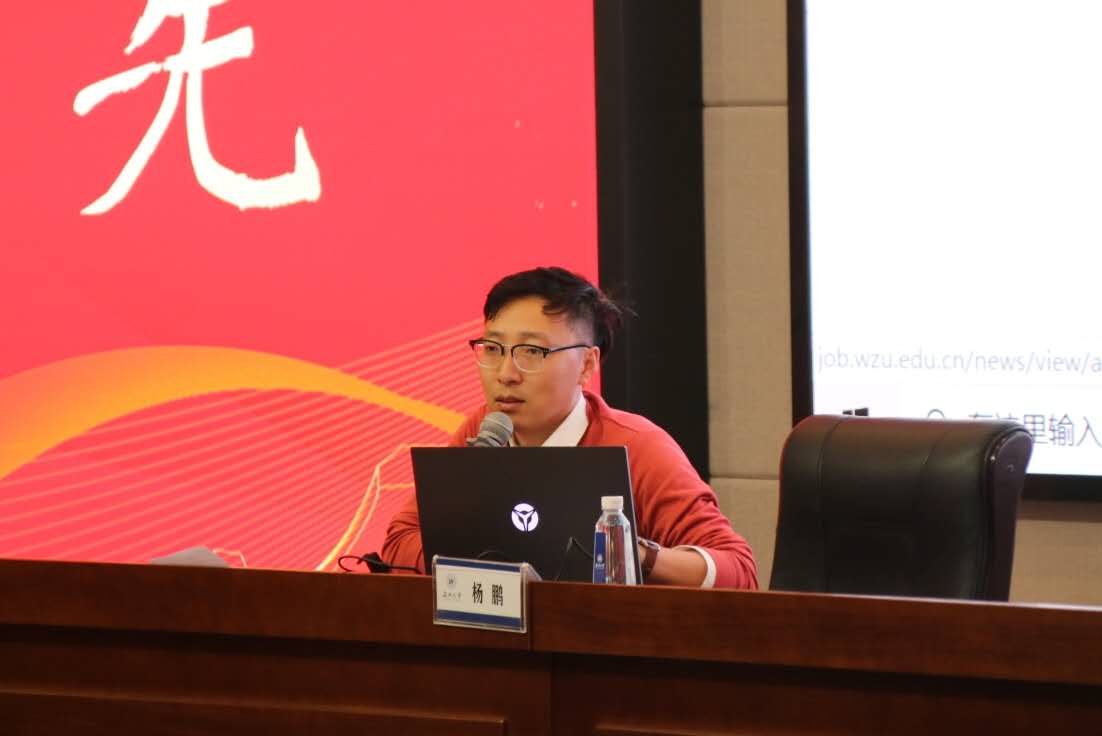 大会开始,学工办主任杨鹏老师先对就业手续、形势政策、就业 定位和应知概念等部分一一加以解读:详细讲解了时时彩 就业系统、就业微信公众号的使用;分析了近几 年的毕业生就业形势,着重列出美院本科、硕士毕业生的就业和流向数据,为21届毕业生就业提供更多 参考;普及了毕业生应该知道的一些基本概念,提醒大家注意毕业、就业的重要时间节点,办理好三方 协议、就业劳动合同等。此外,杨老师还对毕业生留温、选调、自主创业、时时彩 志愿服务西部计划和毕 业生困难补助等就业政策做了详细解读,并结合往年数据指导大家做出更准确的就业定位。最后,杨老 师提出大学生就职,忌贪心,忌急心,忌糊涂心,并通过实际案例对应届毕业生进行了就业安全的教育 。