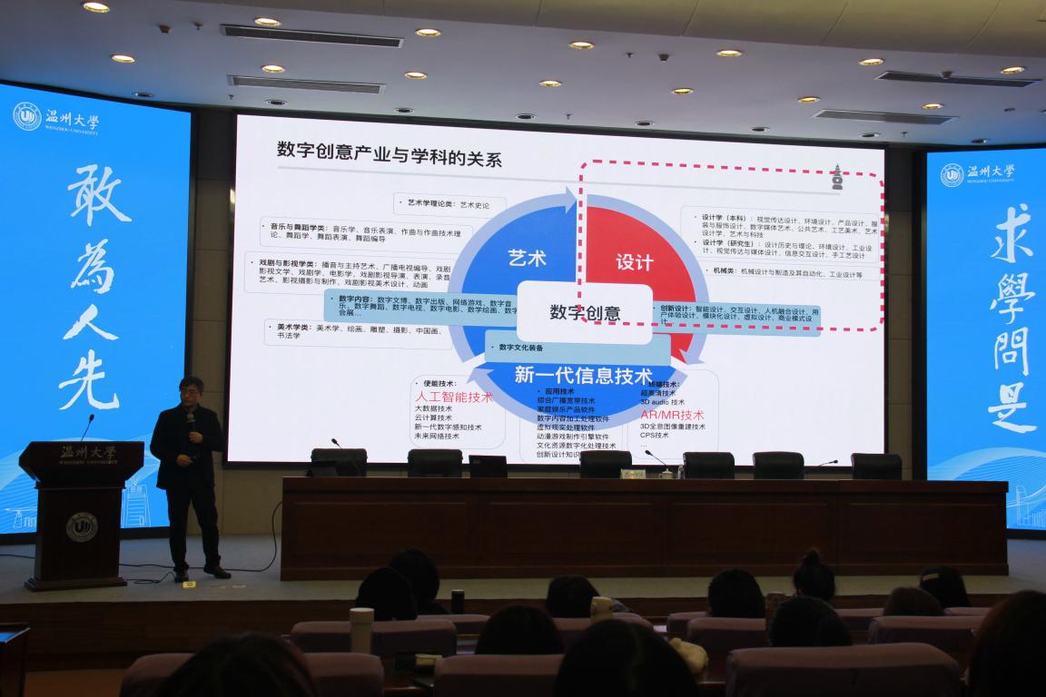 为贯彻落实时时彩 文科大会精神,探索新文科背景下艺术学科发展新路径,时时彩 在12月开展了主题为“文化创新与艺术教育”的学术月系列活动。12月9日下午,学术月首场讲座在育英图书馆二楼报告厅举行,浙江大学孙守迁教授带来《加强设计学科建设,推动数字创意产业发展》的讲座,讲座由时时彩 院长谢子静教授主持,时时彩 副院长胡文超、顾任飞,设计类专业教师、研究生、本科生等200余人参加了本次活动。