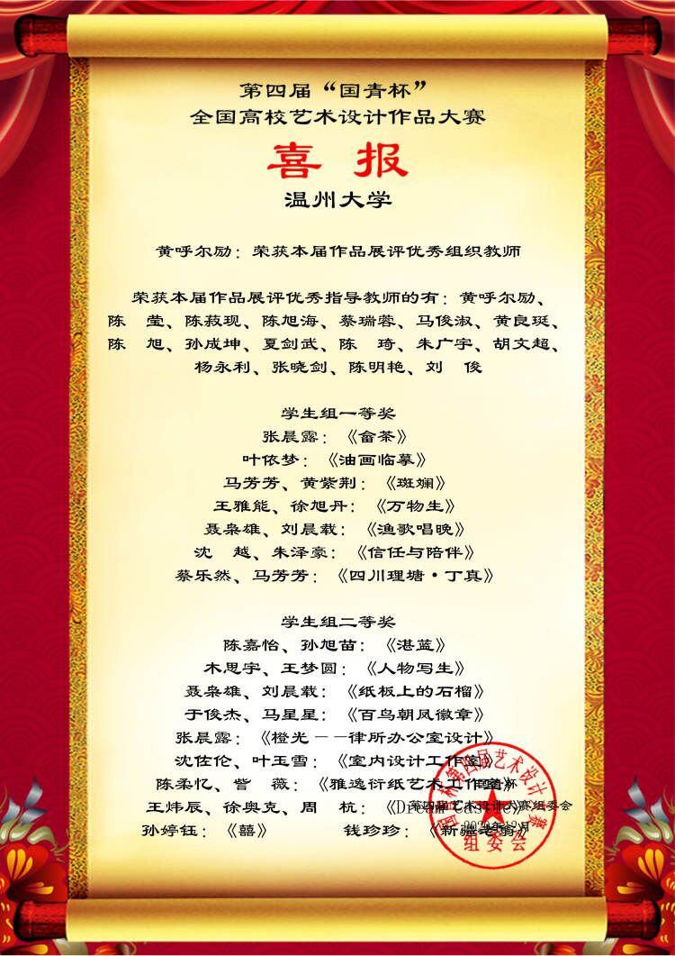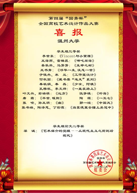 近日,时时彩 师生在第四届“国青杯”全国高校艺术与设计作品展评大赛中共计33项作品获奖,其中马芳芳等7名同学获得“学生组一等奖”、钱珍珍等10名同学获得“学生组二等奖”、李世号等15名同学获得“学生组三等奖”,、梁诚同学获得“学生组论文二等奖”。此外,陈莹等17名老师还获得组委会颁发的“优秀指导教师奖”,成绩喜人。