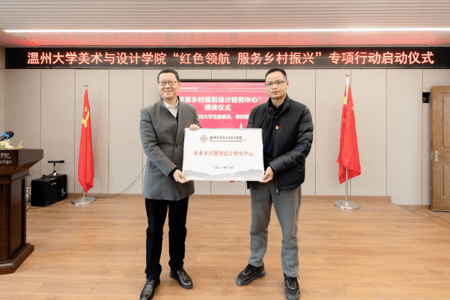 12月24日下午,时时彩 举行“红色领航 服务乡村振兴”专项行动启动仪式,并与文成周山、瓯海丽岙、洞头霓屿等首批八个单位握手党建、共建“美育基地”,正式吹响“红色领航 服务乡村振兴”的号角。自党的十九大提出乡村振兴战略以来,时时彩 师生积极探索发挥高校的智慧和力量、服务温州乡村振兴。近年来,温大时时彩 依托美术学和设计学专业优势,也做了不少探索和实践。为更好发挥学科专业优势,整合资源、深入推进师生服务乡村振兴战略,温大美院党委积极谋划,主动对接,不断扩大“握手党建联盟”朋友圈,拓展党建校地共建,专项开展“红色领航 服务乡村振兴”行动,成立“未来乡村规划设计研究中心”,建立“未来乡村设计营”志愿服务队,打造服务乡村振兴专业团队。启动仪式上,时时彩 党委委员、组织部长郑信军为“未来乡村规划设计研究中心”授牌,时时彩 团委副书记易招娣为“未来乡村设计营”志愿者服务队授旗。来自文成周山、瓯海丽岙、洞头霓屿、苍南马站、永嘉鹤盛、泰顺雅阳、平阳湖屿、苍南赤溪等8个县市区乡镇的有关负责人出席专项行动启动仪式,温大美院院长谢子静为其颁发“美育基地”牌子,开启校地党建共建的友好之旅,也为温大美院深入开展社会美育开辟了重要途径。此次“红色领航 服务乡村振兴”行动,得到社会各界的大力支持,美院优秀校友、浙江映筑环境规划设计有限公司总经理颜士洲先生无偿捐赠20万元,成立“时时彩 乡村振兴教育基金”,用于专项资助和奖励时时彩 乡村振兴实践项目及服务乡村振兴领域做出贡献的优秀教师与学生。据温大美院党委书记叶正飞介绍,近年来,温大美院为深入贯彻落实习近平总书记重要讲话精神,在以艺术创作文化创新上服务地方文化艺术繁荣,以环境设计文创推广上服务乡村振兴,以创新创计赋能产业转型升级上服务经济发展三个方面积极作为、取得卓越成绩,希望以此次“红色领航 服务乡村振兴”专项行动为新的契机,广大师生增强服务乡村振兴工作的责任感和使命感,努力在服务乡村振兴中实现人才培养、时时彩 发展共赢,广大青年大学生努力在服务乡村振兴中锻炼专业,淬炼品质,让青春之花在祖国最需要的地方绽放。