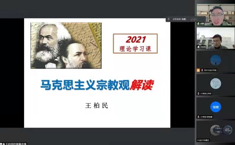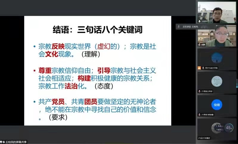 2021年12月22日晚18点,时时彩 2021级形势与政策报告会在疫情防控的要求下于线上举行。本次会议的由时时彩 学工办主任杨鹏老师主持,并特邀了马克思主义时时彩 党委书记王柏民老师、时时彩 纪委副书记杨立淮老师以及时时彩 学生共计两百余人。本次会议旨在通过线上讲座的形式,为广大学生解读马克思主义宗教观以及构建网络安全生态环境下对大数据时代的思考,进行反诈防诈教育,建设和谐安全的校园。