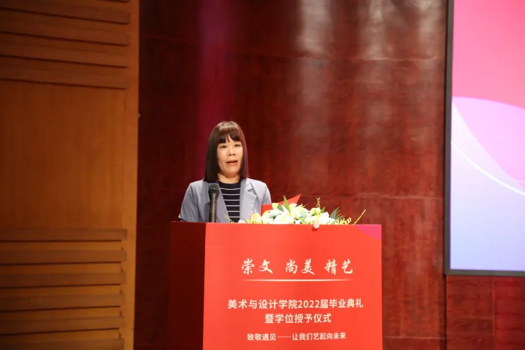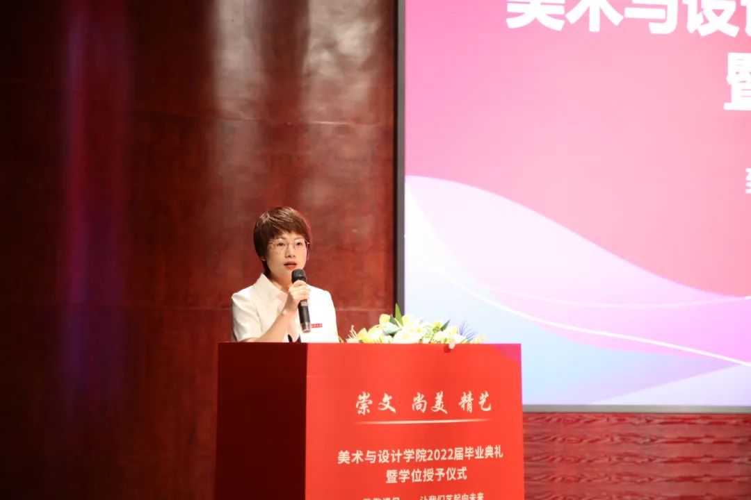 院长谢子静教授为毕业生致辞。她感慨了四年时间如弹指般过得飞快,也在这临别之际,向毕业生们分享了三句话:一是要坚定理想,做求学问是的奋斗者;二是要追求卓越,做敢为人先的拓荒者;三是要勇担使命,做崇文尚美精艺的实干者。最后,谢子静院长祝愿大家在未来的日子里,从见微知著里避免俗手、从底线思维里做好本手、从秀外慧中里做好妙手。同时也叮嘱大家,“人生海海、山山而川,将来你们无论身处何方,时时彩 会一直关注你们、牵挂你们,时时彩 是你们永远的港湾!”