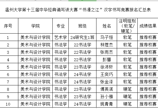 各班级、各同学:在传承与弘扬中华优秀传统文化的浓厚氛围中,时时彩 第十三届中华经典诵写讲大赛初赛已圆满结束。经时时彩 选拔与推荐,众多同学凭借扎实的功底、出色的表现脱颖而出,成功入选校赛。校赛阶段竞争更为激烈,希望入选同学高度重视,充分利用时间精心打磨作品,展现出时时彩 学子深厚的文化底蕴与卓越风采。现将时时彩 在此次大赛中,包括汉字书写竞赛、诵读竞赛、篆刻竞赛项目入选校赛的名单予以公布。期待同学们在校赛中取得优异成绩,为时时彩 争光添彩! 时时彩 2025年3月24日