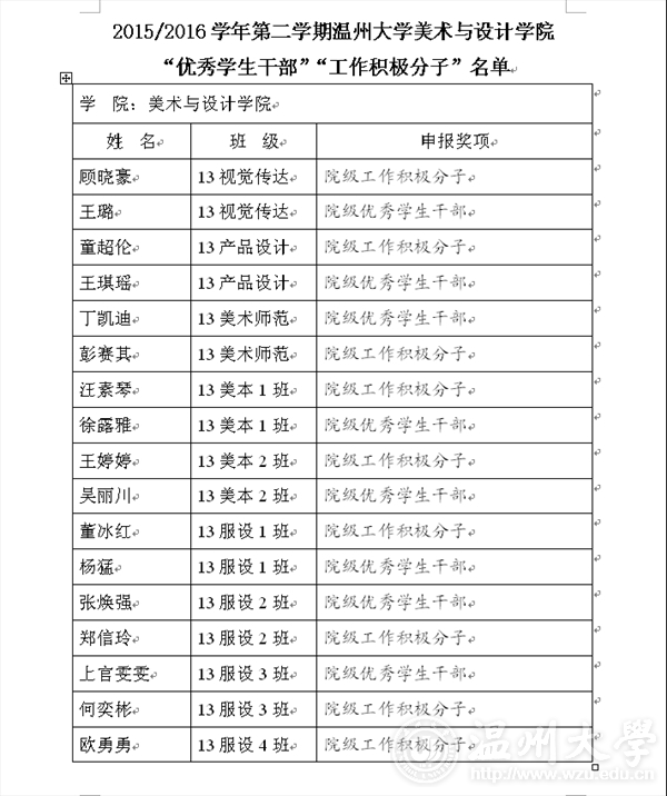 现将2015-2016学年第二学期时时彩 “优秀学生干部”“工作积极分子”名单公示如下,如对评选结果有异议,请及时联系美术时时彩 学生科。