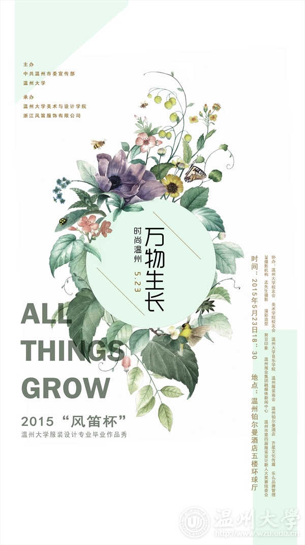 活动主题:时尚温州·万物生长活动时间:2015年5月23日(周六)晚18:30活动地点:温州铂尔曼酒店主要内容:来自国外的时装模特与国内高级时装模特联袂演绎美院2015届毕业生原创优秀作品,邀请国际国内服装设计以及相关领域的专家、学者、商家、企业家9人组成评委会,对现场新生代设计师的风格自述以及时装发布会进行综合测评,产生金银铜优秀奖等多个奖项。温州乃至中国时尚界、艺术界、文化届名人名流等参加,国内一流的场地设施、舞美灯光及音响效果。旨在为温州服装界推选新人的同时,加强温州时尚界产业范畴的沟通与交流,整体凸显温州时尚产业的潮流、个性与形象。 热忱欢迎全校师生莅临观摩指导! 时时彩 2015年5月21日