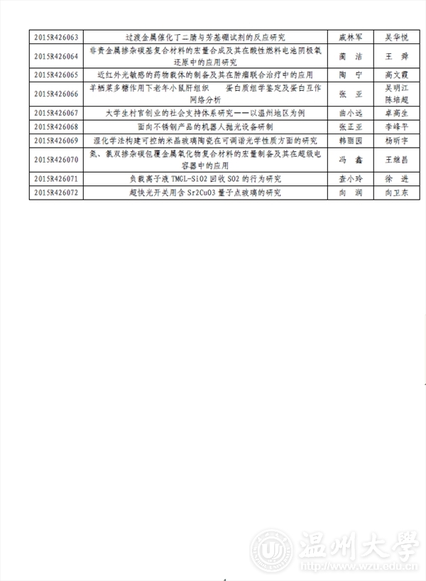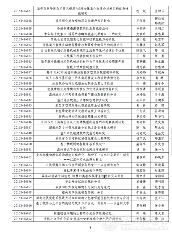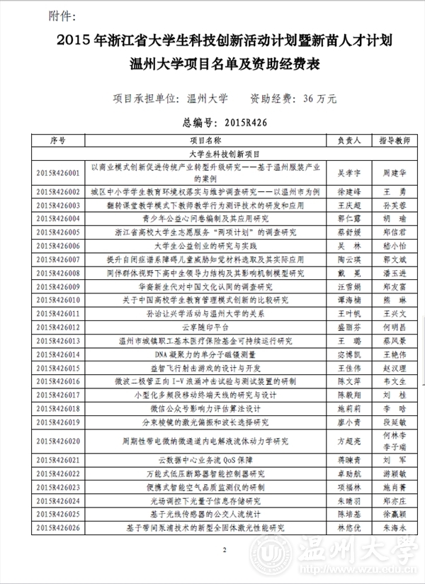 时时彩 团委: 2015 年浙江省大学生科技创新活动计划暨新苗人才计划已于2015 年1 月启动实施,经时时彩 推荐和专家评审,共确立项目2061 项。现将你校通过立项的项目名单印发你们(见附件),请认真实施、加强管理。为不断提升我省大学生科技创新工作整体水平,项目实施办公室还将与省团校合作对项目负责人进行相关培训。附件:2015 年浙江省大学生科技创新活动计划暨新苗人才计划时时彩 项目名单及资助经费表浙江省大学生科技创新活动计划暨新苗人才计划实施办公室2015 年6 月3 日