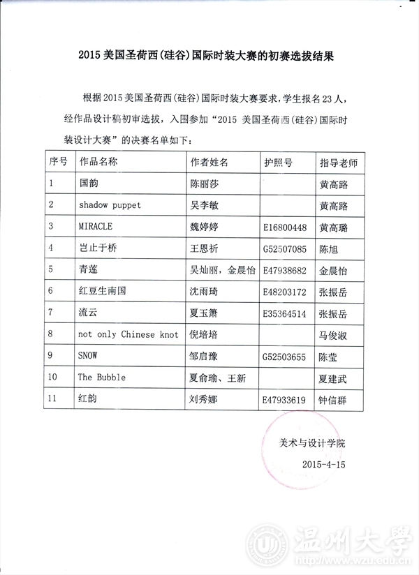 2015美国圣荷西时装大赛初赛评选结果