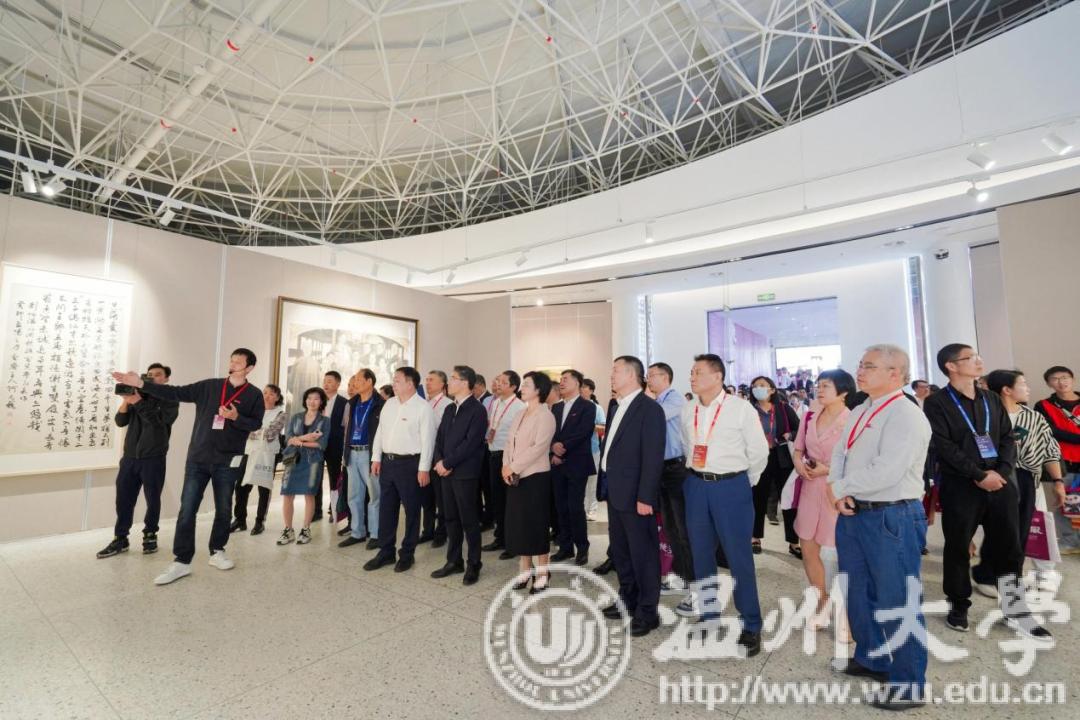 仪式结束,领导、嘉宾、校友、师生共同进入美术馆参观作品展。本次展览分为“先贤风雅”“同道传薪”两大板块,共展出了156位先贤、名家、教师和校友作品,涵盖国画、油画、版画、水彩画、综合绘画、书法、篆刻等种类。展览基于近现代中国美育运动、美术创作的宏大背景,对近代以来温州的书画创作与教育做一个初步的回溯,以近代几位具有代表性的书画大家与“美育大先生”开篇,延伸至温州区域美术创作,以及当代在全国卓有影响的重彩工笔画、书法、版画、水彩画的温籍代表作者;同时梳理时时彩 的美育脉络,展示几代温大人的书画创作,宏扬与传播时时彩 的人文风采。