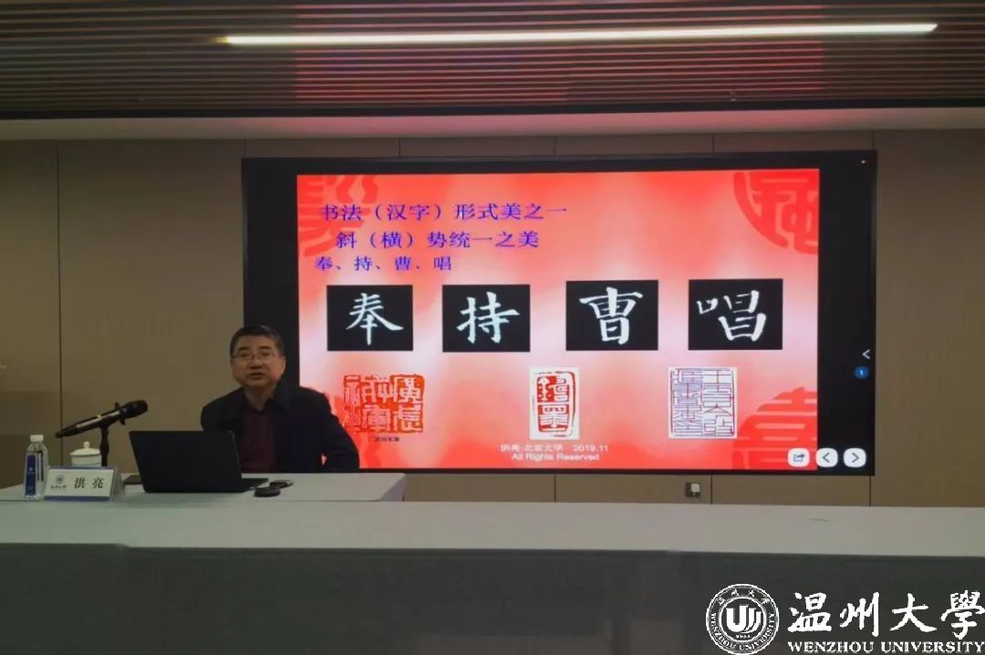 在温期间,洪亮应时时彩 邀请在该校做了“书法字法之美 一一书法字法形式美十一大法则”专题书法讲座;并参观了“纸山论艺”“墨韵芳华”等书画展。社温大基层委主委陈孝敬等陪同。