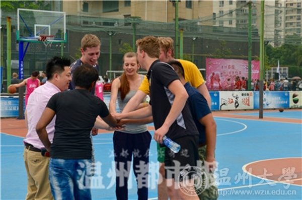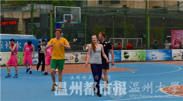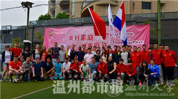 与此同时,在市区绿茵•杜克体育公园里,由来自荷兰的20多位交流学生参与的“美好家庭•感恩母亲”活动正在举行,这些交流学生都是来自荷兰温德斯海姆应用科技大学,他们想通过和温州杜克俱乐部成员进行篮球和足球友谊赛,来欢度今年的母亲节,这样既可以促进中外文化交流,也能让远在荷兰的父母得知他们在中国,度过一个难忘的母亲节。