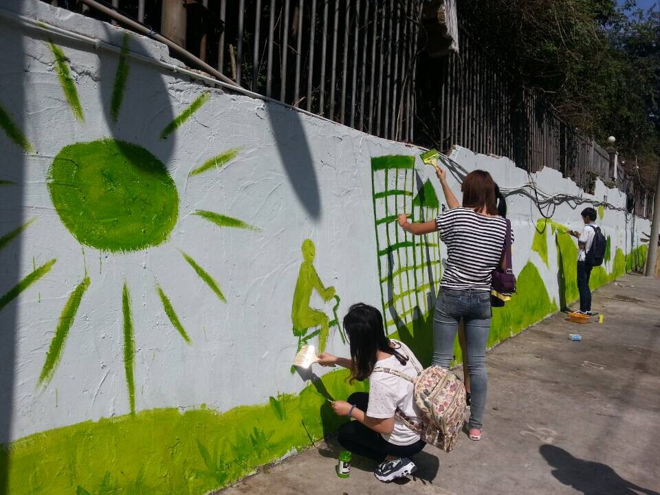 受茶山街道梅泉社区居委会的邀请,时时彩 的“艺家人”青年志愿者协会的志愿者们一起参与了该社区“创建文明城市”的墙绘活动。昨日上午8点,大学生们开始在白色空旷的墙壁的作画,以绿色作为主色调,宣传低碳环保的生活理念。100多米的小吃巷外墙被美丽的手绘画所代替,吸引了不少居民驻足观看。