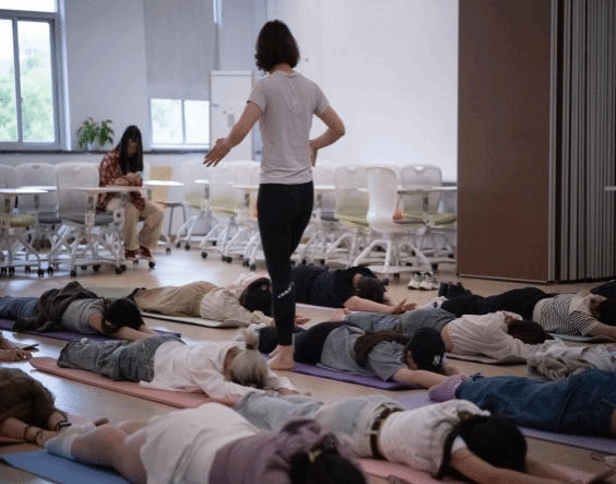 最后一个环节正念冥想。同学们平躺在瑜伽垫上,在林老师舒缓的引导语中,进入了深度的放松状态。大家仿佛置身于一个宁静的空间,抛开了外界的喧嚣和烦恼,只专注于自己的内心世界。冥想结束后,同学们缓缓睁开眼睛,脸上都带着平和的神情,纷纷表示自己的身心都得到了极大的放松。