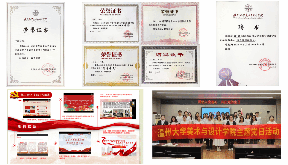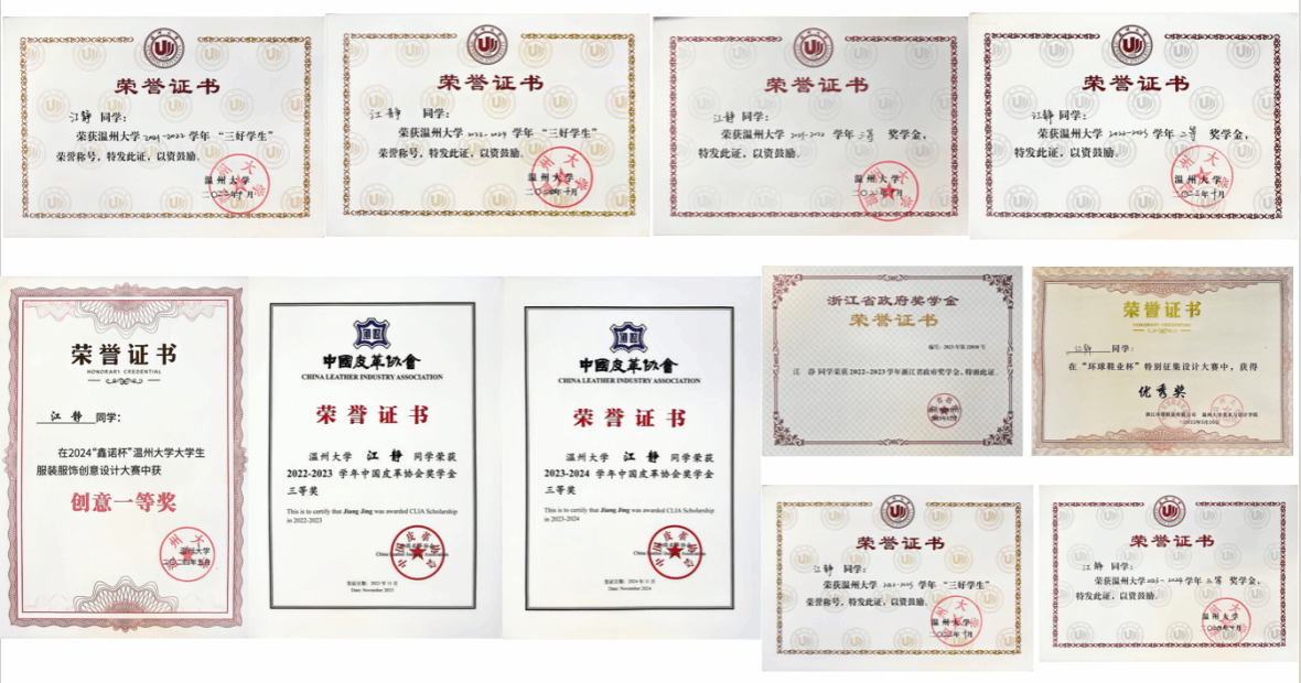 “学如逆水行舟,不进则退。”学习是学生的核心任务,作为党员,更应以严谨态度认真完成各项学习任务,发挥先锋模范作用。在校期间,江静综合测评连续两年位列班级前三,平均绩点达3.9,多次荣获时时彩 “三好学生”称号及二等奖学金。她积极投身专业设计大赛,如中国(深圳)国际鞋包设计大赛、“环球鞋业杯”特别征集设计大赛、中国皮革协会设计大赛等,通过实践不断提升专业能力。