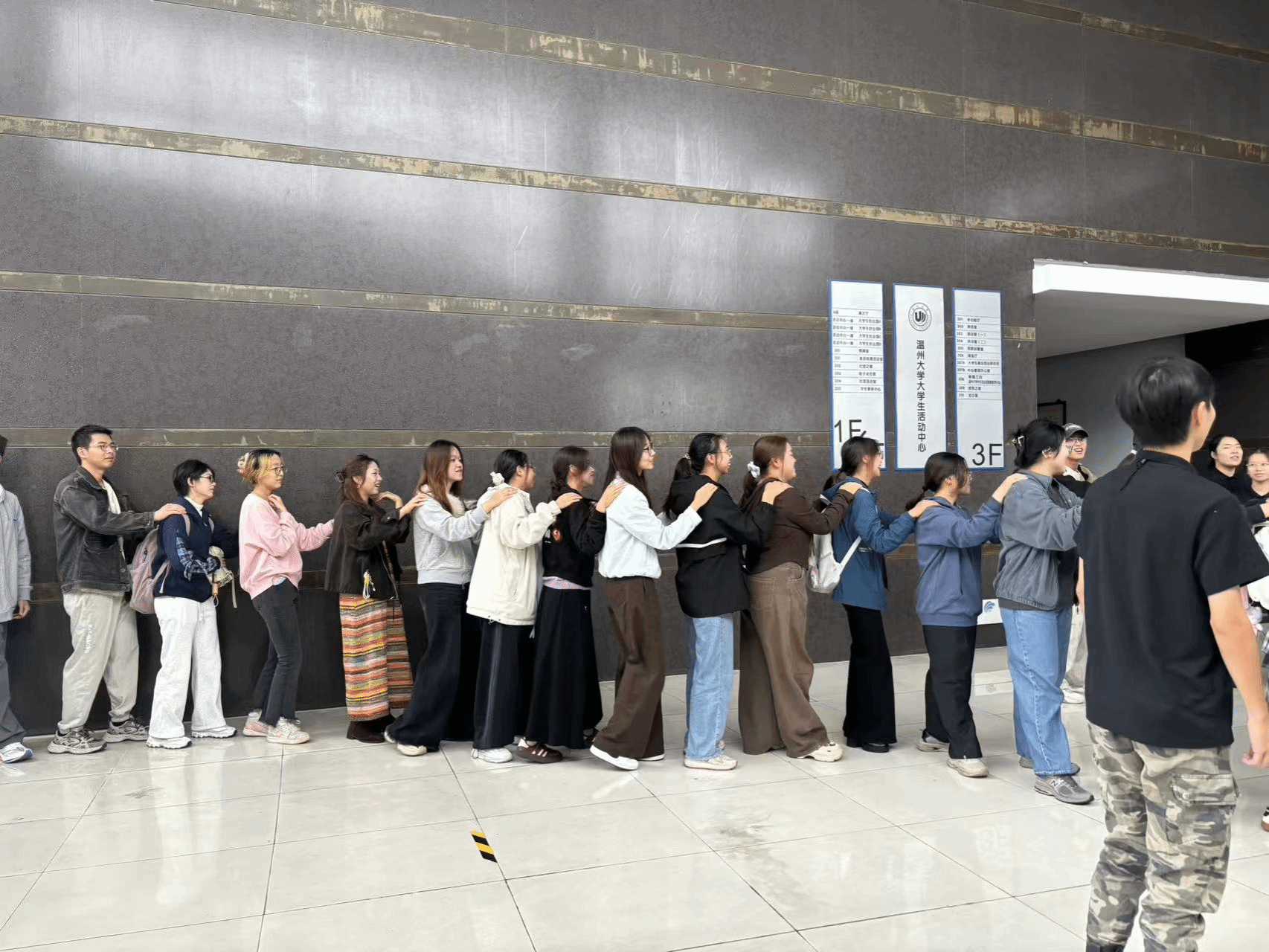 活动伊始,参与培训的团学干部们被随机分为四支队伍,他们精神抖擞,对即将开始的挑战充满了期待。首先通过别开生面的预热游戏迅速点燃了全场热情。“拳王”游戏中,大家通过简单的“石头剪刀布”展开对决,胜者身后追随的队伍如游龙般越接越长,笑语欢声中将彼此的距离瞬间拉近。紧随其后的“今天去买菜”更是妙趣横生,男生女生分别代表“五毛”和“一块”,在主持人的报价声中快速跑动、组合抱团,在紧张刺激的“凑数”中打破了团队的隔阂。